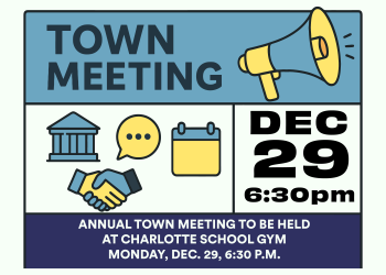 ANNUAL TOWN MEETING DEC 29, 6:30 P.M.: The 2025 Annual Town Meeting will be held Monday, December 29, at 6:30 p.m. at the Charlotte School Gym. The meeting warrant has been posted at the Town Hall. The 2024 Annual Town Report is available on the website and are being mailed to residents.